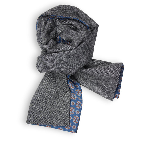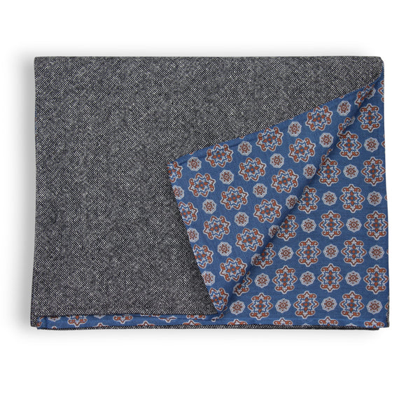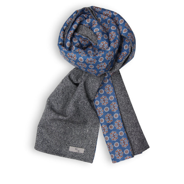 Beautiful Woolscarf in Tweed look colour antracite combined with a beautiful Geometric Ornamental Pattern in soft electric blue and orange colours on Cotton & Silk Blend