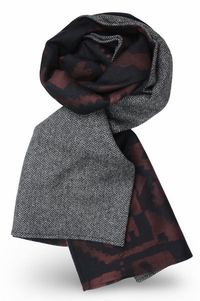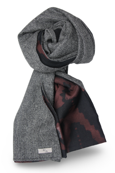 Antracite melange Herringbone Wool in beautiful contrast with the Batik style Print in black and bordeaux tones on Cotton & Silk