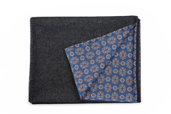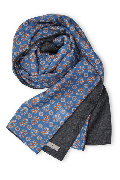 Beautiful Woolscarf in colour antracite combined with a beautiful Geometric Ornamental Pattern in soft electric blue and orange colours on Cotton & Silk Blend